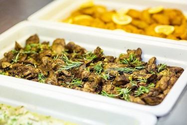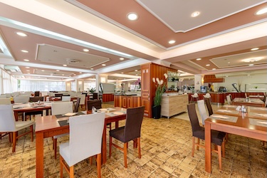 Stravování v hotelové restauraci - polopenze formou samoobslužného bohatého bufetu se středomořskou kuchyní, snídaně včetně teplých i studených nápojů, u večeře automat s nápoji: voda, ovocné šťávy, víno, pivo.